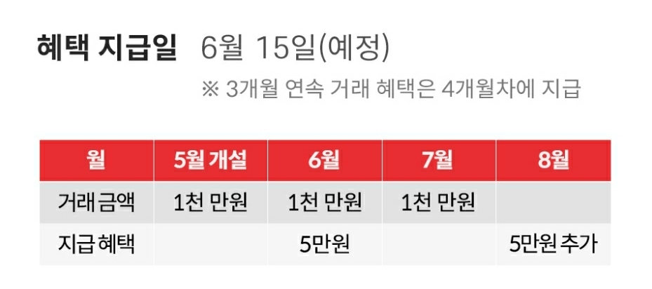 3개월 연속 1천만 원 이상 거래 시 5만 원 추가 (개설 월 포함)