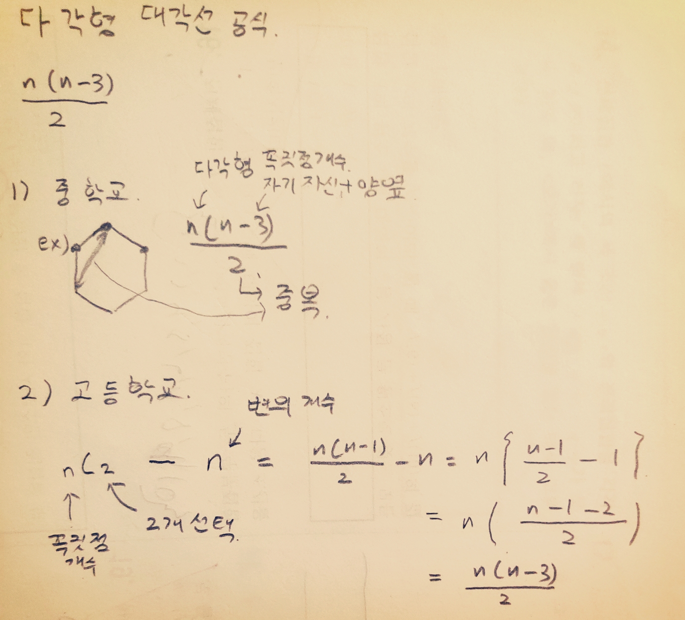 꼭짓점 n개 중에 2점을 택해야 선분이 그려집니다. 근데 대각선은 다각형에 변이 아니므로 n 개 만큼을 빼줍니다. 식을 정리하게 되면 중학교때 배운 공식이 다시 나옵니다.