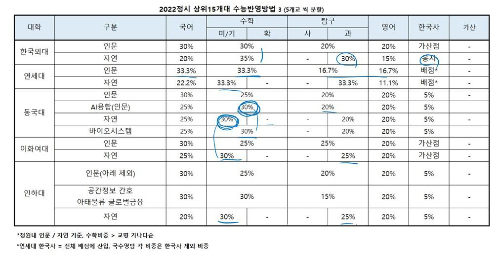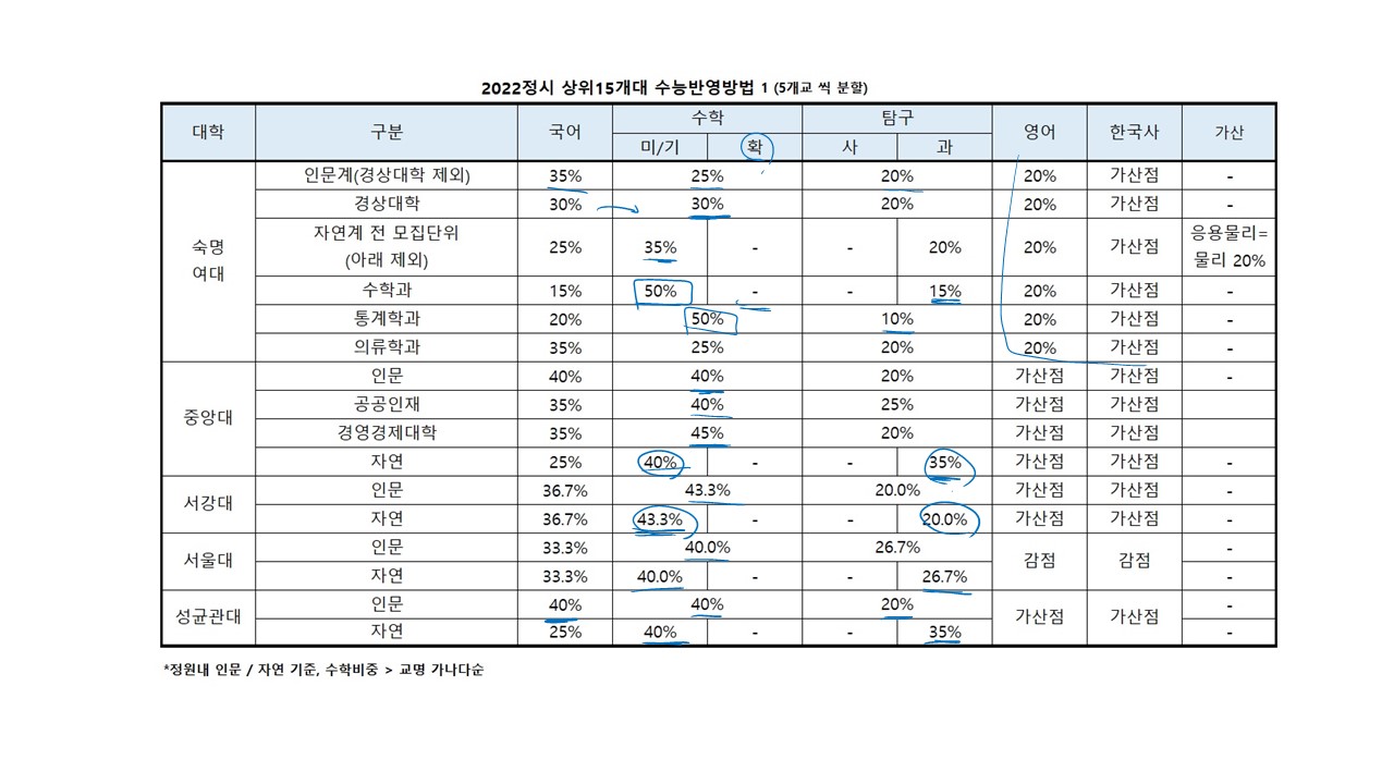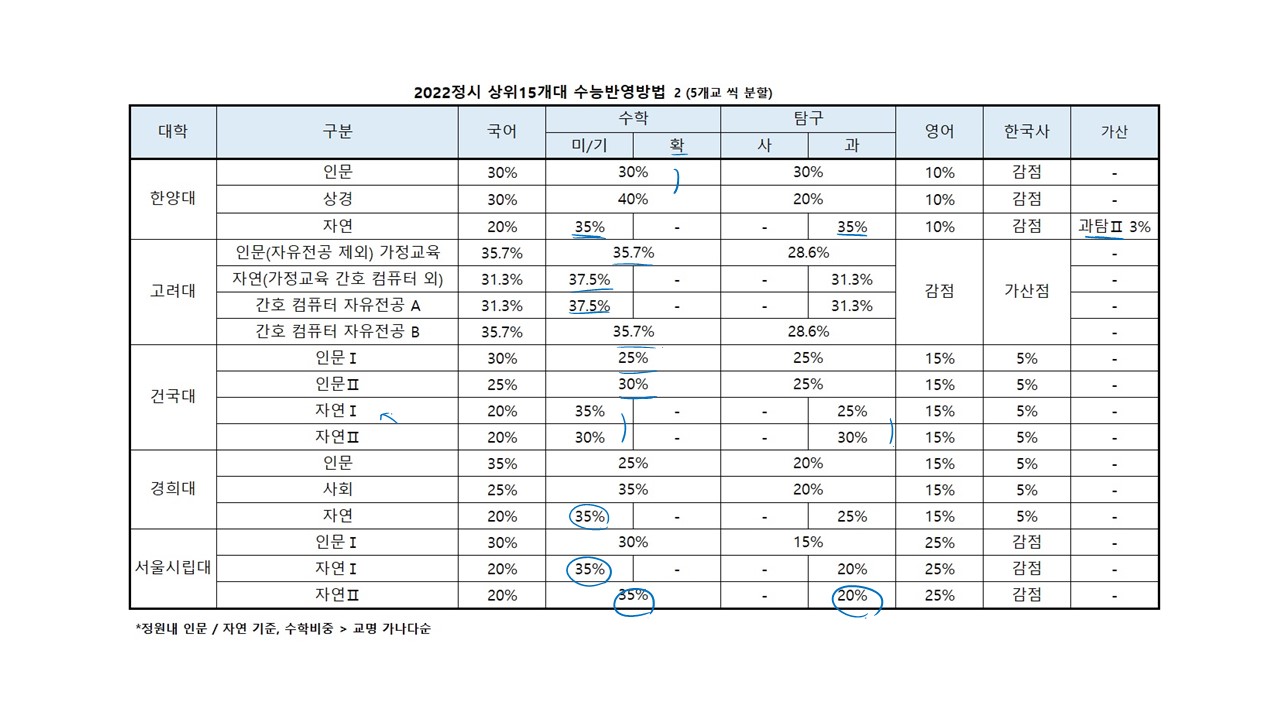 여기에서는 수학 비중이 높아도 35%인 외대가 제일 높은 축에 속합니다.