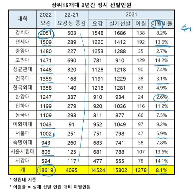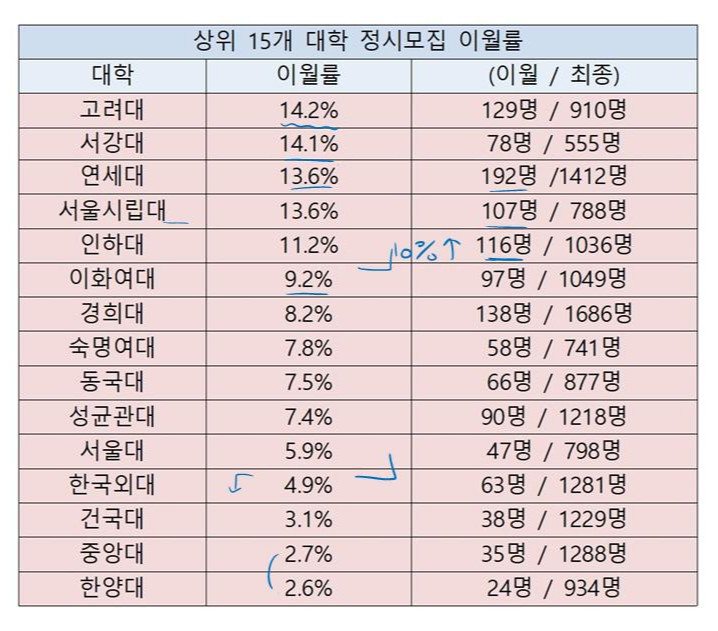 연세대와 시립대가 13%였습니다. 인하대도 11%대였네요. 이화여대 부터 그래도 한자리수에 이월률이 발생 했습니다. 서울대는 써놓고 의대로 빠지나 봅니다.
