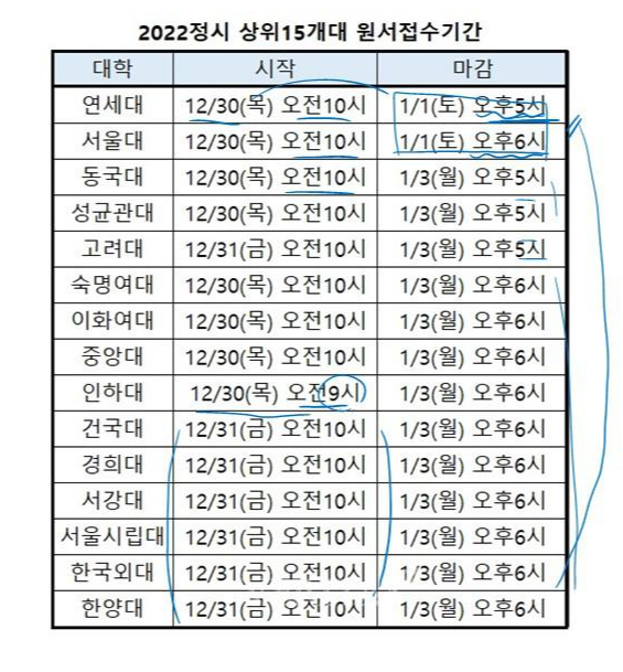 대부분 12월 30일이나 31일입니다. 원서접수 마감날은 대부부 1월 3일 이지만 서울대와 연세대는 1월 1일로 빠르게 마감하네요.